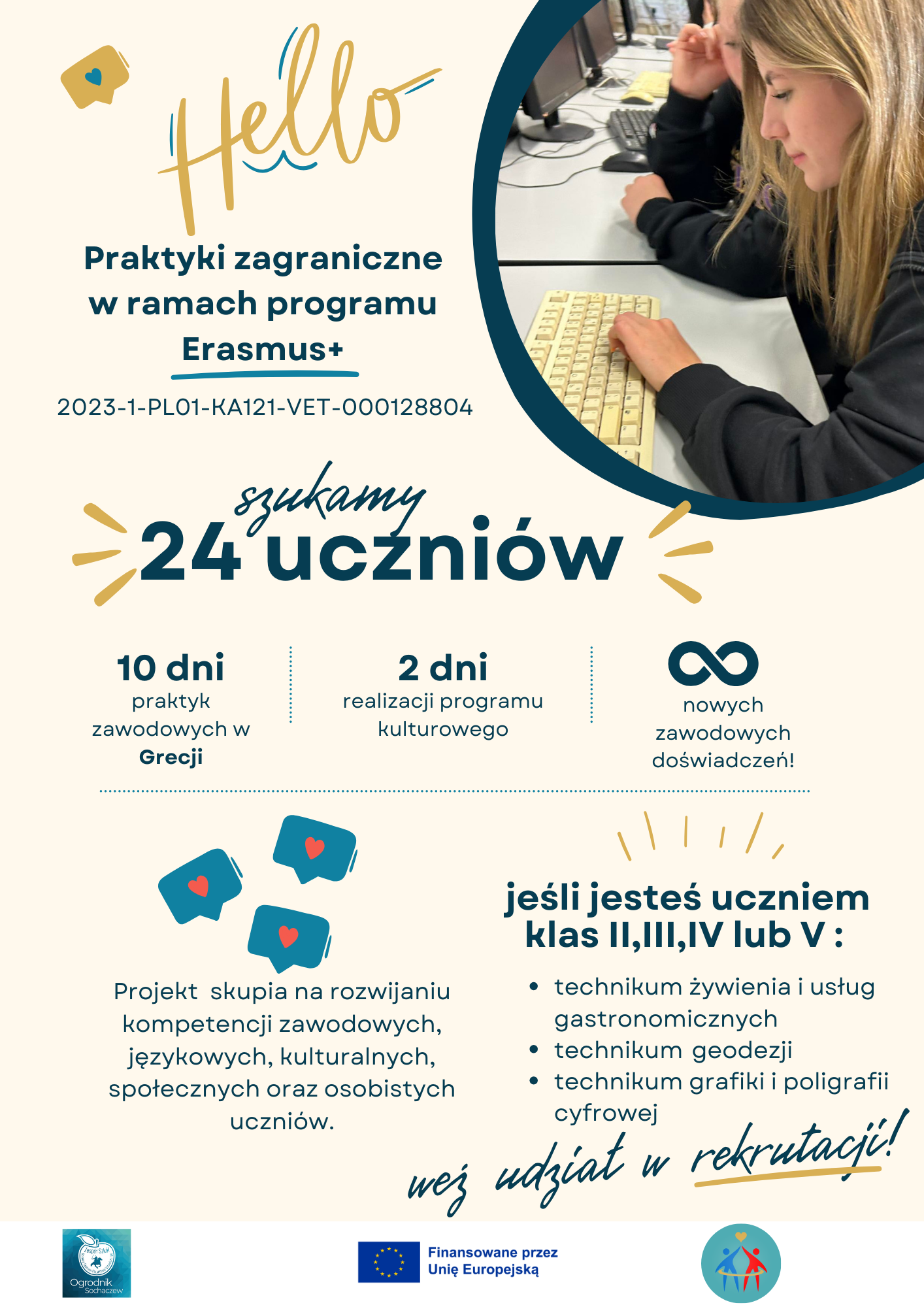 Wyniki Rekrutacji - Projekt Erasmus+„Nowe perspektywy kształcenia zawodowego – EDYCJA 2023”, numer 2023-1-PL01-KA121-VET-000128804 Drodzy Uczniowie i Rodzice! Z przyjemnością informujemy, że wyniki rekrutacji do projektu Erasmus+ o numerze 2023-1-PL01-KA121-VET-000128804 są już dostępne! Pełna lista 24 uczestników oraz lista rezerwowa dostępna jest w załączniku, a także w sekretariacie szkoły. Gratulujemy wszystkim zakwalifikowanym uczniom i życzymy owocnych praktyk i czasu spędzonego na mobilności w Grecji!