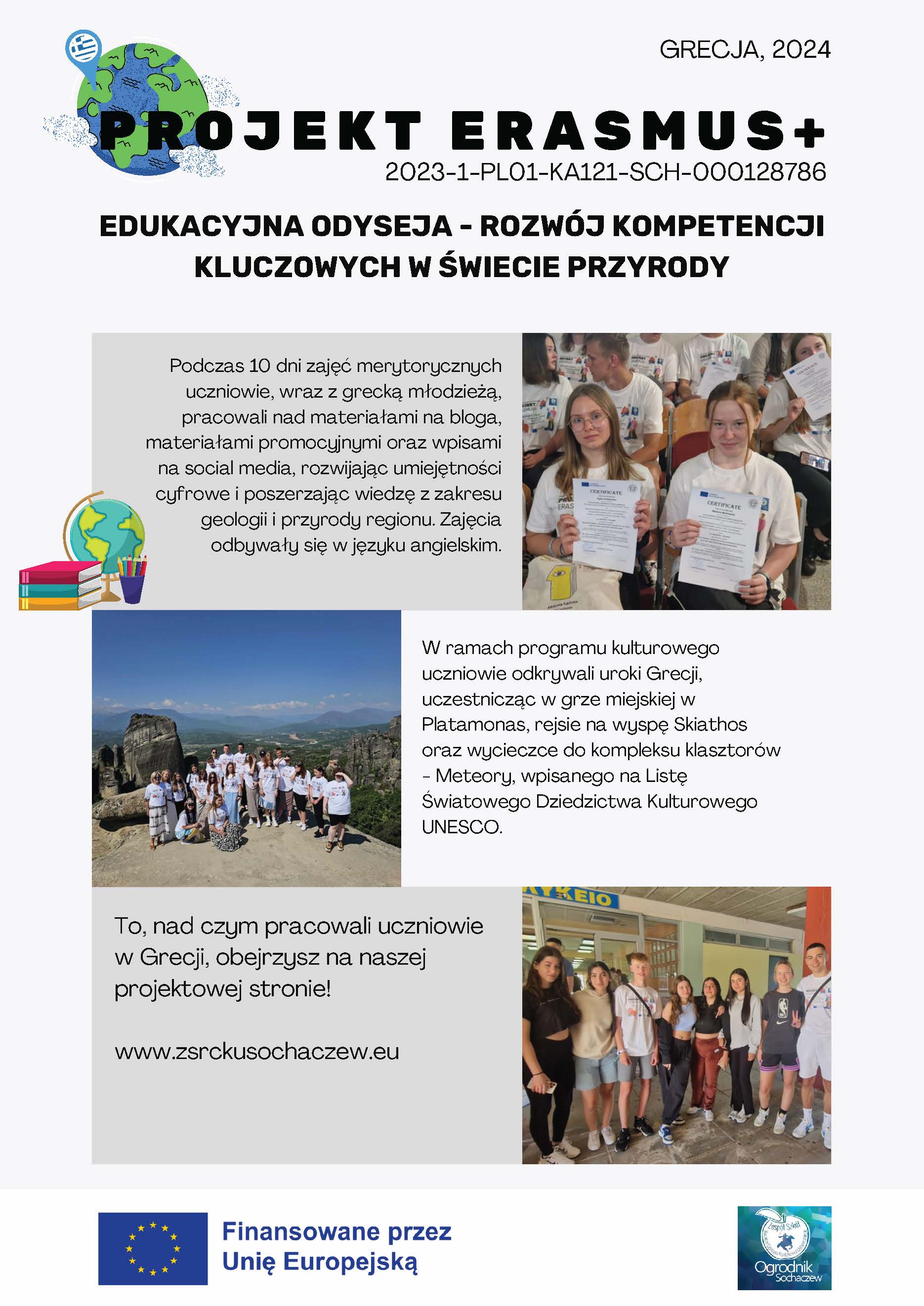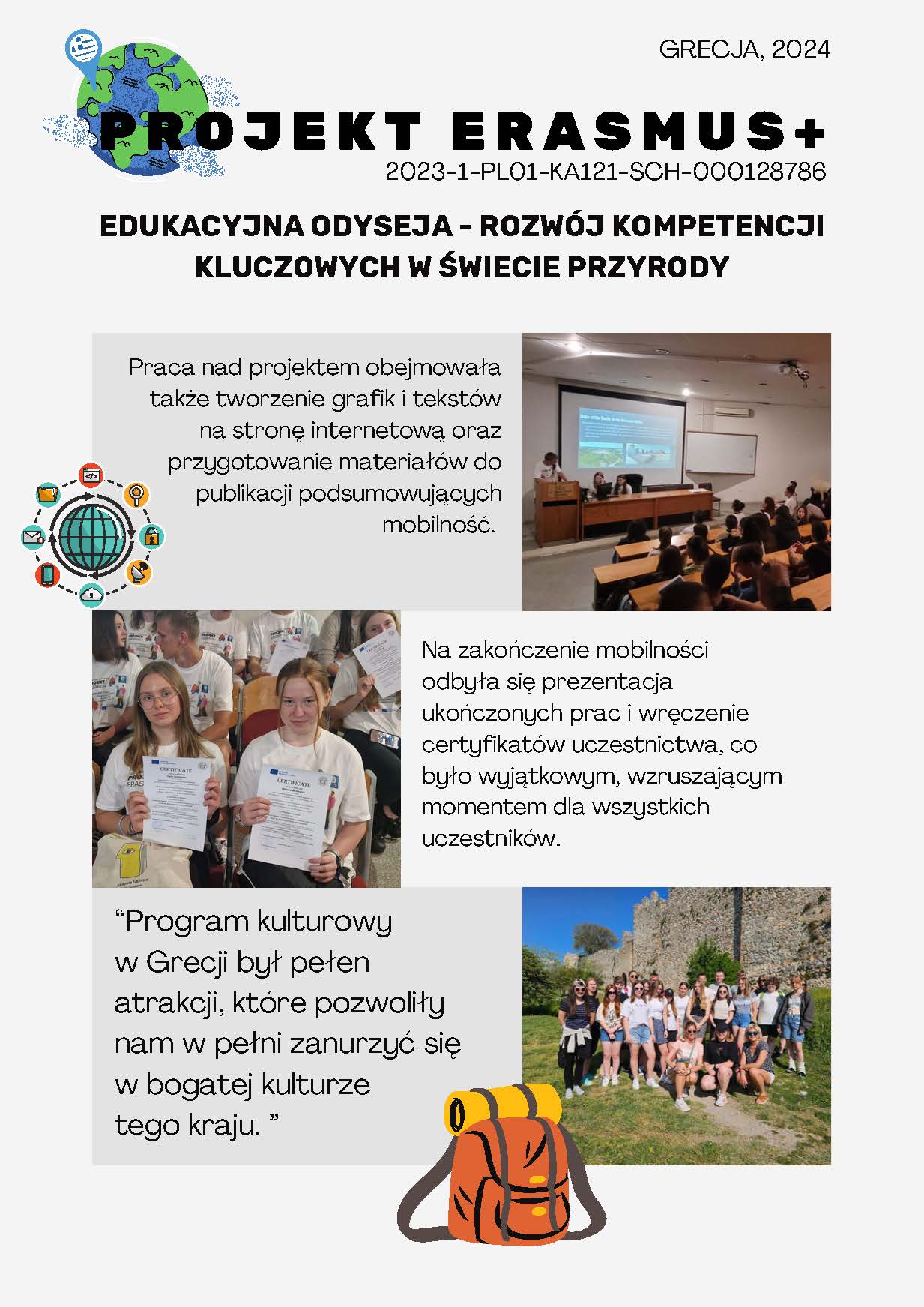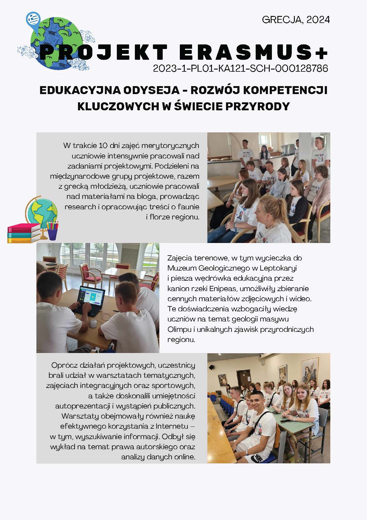 W trakcie 10 dni zajęć merytorycznych uczniowie intensywnie pracowali nad zadaniami projektowymi. Podzieleni na międzynarodowe grupy projektowe, razem z grecką młodzieżą, uczniowie pracowali nad materiałami na bloga, prowadząc research i opracowując treści o faunie i florze regionu. Zajęcia terenowe, w tym wycieczka do Muzeum Geologicznego w Leptokaryi i piesza wędrówka edukacyjna przez kanion rzeki Enipeas, umożliwiły zbieranie cennych materiałów zdjęciowych i wideo. Te doświadczenia wzbogaciły wiedzę uczniów na temat geologii masywu Olimpu i unikalnych zjawisk przyrodniczych regionu. Oprócz działań projektowych, uczestnicy brali udział w warsztatach tematycznych, zajęciach integracyjnych oraz sportowych, a także doskonalili umiejętności autoprezentacji i wystąpień publicznych. Warsztaty obejmowały również naukę efektywnego korzystania z Internetu – w tym, wyszukiwanie informacji. Odbył się wykład na temat prawa autorskiego oraz analizy danych online. To wszystko przełożyło się na rozwijanie kompetencji cyfrowych uczestników. Praca nad projektem obejmowała także tworzenie grafik i tekstów na stronę internetową oraz przygotowanie materiałów do publikacji podsumowujących mobilność. Na zakończenie mobilności odbyła się prezentacja ukończonych prac i wręczenie certyfikatów uczestnictwa, co było wyjątkowym, wzruszającym momentem dla wszystkich uczestników.