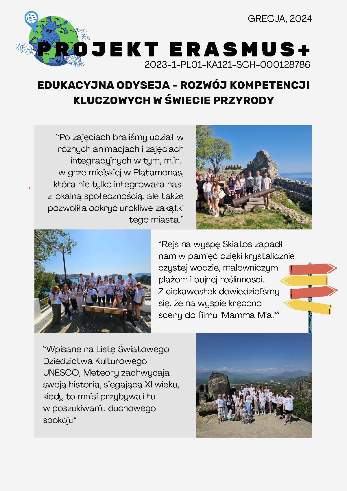 Program kulturowy wyglądał tak: „Program kulturowy w Grecji był pełen atrakcji, które pozwoliły nam w pełni zanurzyć się w bogatej kulturze tego kraju. Po zajęciach braliśmy udział w różnych animacjach i zajęciach integracyjnych w tym, m.in. w grze miejskiej w Platamonas, która nie tylko integrowała nas z lokalną społecznością, ale także pozwoliła odkryć urokliwe zakątki tego miasta. Rejs na wyspę Skiatos zapadł nam w pamięć dzięki krystalicznie czystej wodzie, malowniczym plażom i bujnej roślinności. Z ciekawostek