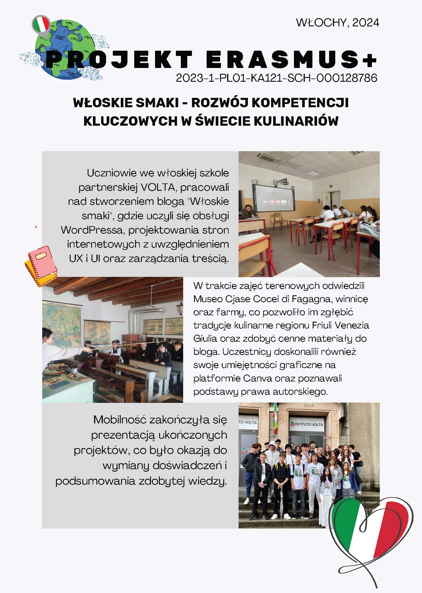 Program merytoryczny mobilności we Włoszech skoncentrował się na rozwijaniu umiejętności cyfrowych, kulinarnych i językowych uczestników. Uczniowie pracowali nad stworzeniem bloga "Włoskie smaki", gdzie uczyli się obsługi WordPressa, projektowania stron internetowych z uwzględnieniem UX i UI oraz zarządzania treścią. W trakcie zajęć terenowych odwiedzili Museo Cjase Cocel di Fagagna, winnicę oraz farmy, co pozwoliło im zgłębić tradycje kulinarne regionu Friuli Venezia Giulia oraz zdobyć cenne materiały do bloga. Uczestnicy doskonalili również swoje umiejętności graficzne na platformie Canva oraz poznawali podstawy prawa autorskiego. Mobilność zakończyła się prezentacją ukończonych projektów, co było okazją do wymiany doświadczeń i podsumowania zdobytej wiedzy.
