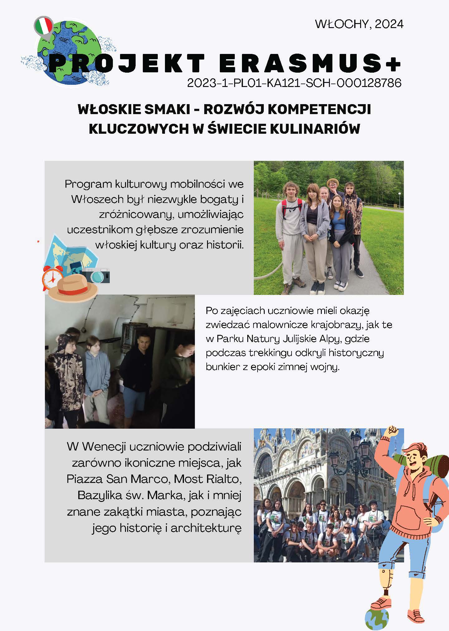 Po zajęciach? Zwiedzamy Włochy: Program kulturowy mobilności we Włoszech był niezwykle bogaty i zróżnicowany, umożliwiając uczestnikom głębsze zrozumienie włoskiej kultury oraz historii. Po zajęciach uczniowie mieli okazję zwiedzać malownicze krajobrazy, jak te w Parku Natury Julijskie Alpy, gdzie podczas trekkingu odkryli historyczny bunkier z epoki zimnej wojny. W Wenecji uczniowie podziwiali zarówno ikoniczne miejsca, jak Piazza San Marco, Most Rialto, Bazylika św. Marka, jak i mniej znane zakątki miasta, poznając jego historię i architekturę. W Trieście uczniowie odwiedzili Ponte Rosso, Piazza Unità d’Italia oraz Kościół św. Spirydona, co przybliżyło im złożoność włoskiej kultury. Odwiedziny w Muzeum Powozów, w willi Manin, na festiwalu smaków oraz w historycznej miejscowości Aquileia z XI-wieczną Bazyliką Matki Bożej Wniebowstąpienia, wzbogaciły ich wiedzę o lokalnej historii i tradycjach. Grado z kolei zapewniło chwilę relaksu na plaży,