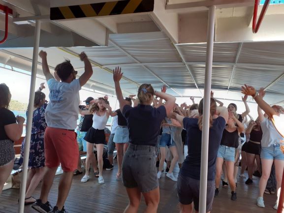 - Całodzienny rejs na maleńką, ale bardzo malowniczą wyspę Agia Kiriaki. Rejs odbył się statkiem „Elizabet Cruises” na pokładzie którego na uczniów czekała moc niespodzianek: greckie szlagiery, nauka tańca Zorba oraz poczęstunek, na który złożyły tradycyjne smakołyki. Po przybiciu do brzegów wysepki odwiedziliśmy mało znany wśród zagranicznych turystów, choć wart uwagi monastyr. Była również chwila na relaks: kąpiel w orzeźwiającej wodzie, do której niektórzy skakali nawet z pokładu statku!